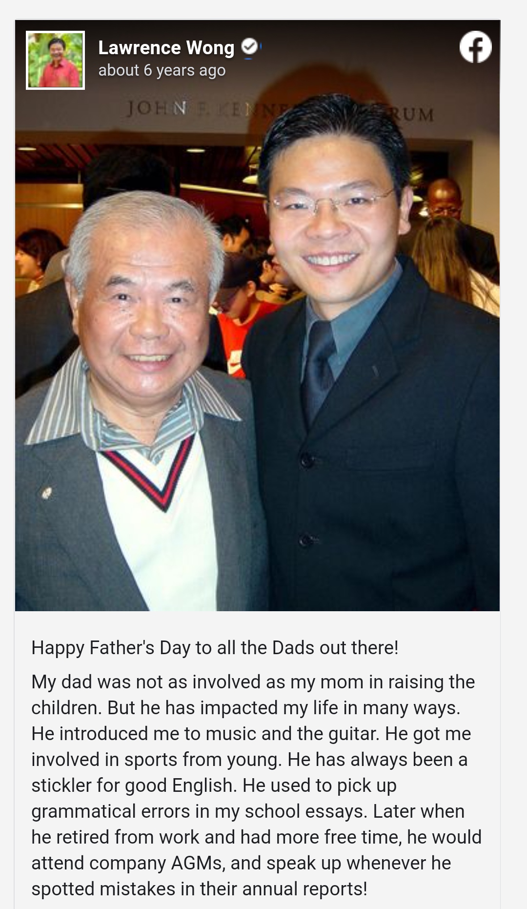 Finance Minister Lawrence Wong paid tribute to his father who has just passed away in a Facebook post on Aug. The article was published recently on may 12. Telegram We are very sad to see him go.