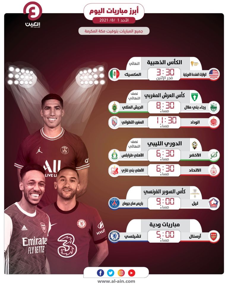 مواعيد مباريات اليوم الأحد 1 أغسطس 2021 والقنوات الناقلة